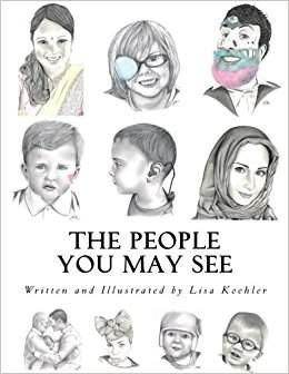 10 hand-drawn portraits of people with various visible differences and disabilities, including facial birthmarks and piercings, wearing bindis, hijabs, or hair wraps, with glasses, cranial orthotic s, cochlear implants, eye patches, and a two-father family.
