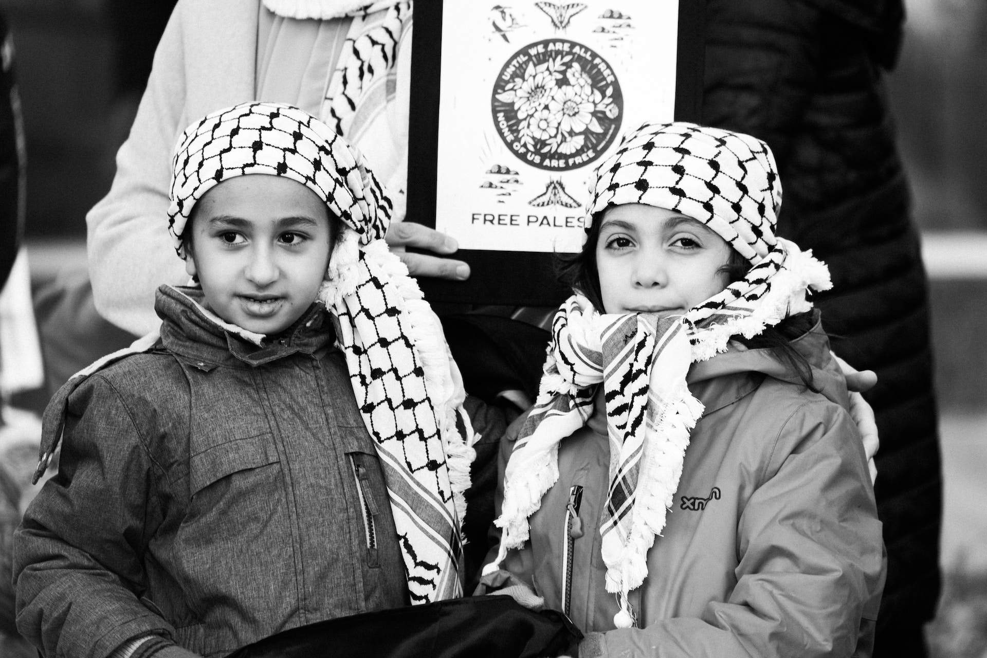 two children wearing keffiyeh at a free palestine rally